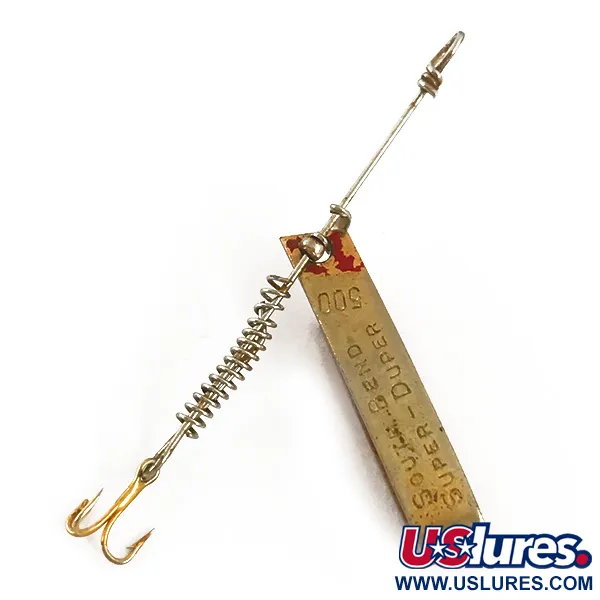 Med en vikt på endast 1,4 g (3/64 oz) uppvisar den nätta ramen på detta ultralätta drag den minimalistiska U-formade design som blev en klassiker för sportfiskare i USA. Mässingskroppen har en distinkt röd markering nära linhålet, vilket kontrasterar mot den metalliska finishen som bär den tydliga prägeln av South Bend-namnet och modellbeteckningen Super Duper 500. Draget är bara 2,5 cm (1") långt och består av en enkel trekrok som är säkrad med en genomgående trådkonstruktion och en skyddande fjäder. Med tanke på dess skickbetyg på 4/5 är draget välbevarat och visar endast lätta ålderstecken i form av mindre färgslitage vid böjen. Den inre trådmonteringen inkluderar en liten metallpärla och en spiralfjäder för att kontrollera krokens position vid kast eller trolling. Detta exemplar, identifierat med produktkod 4684, utnyttjar en enkel men effektiv bockning av metallplattan för att uppnå sin specifika profil.