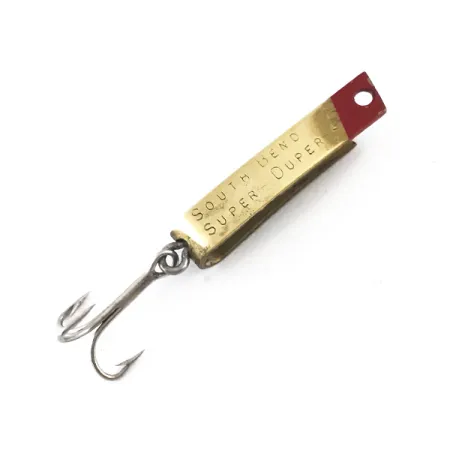 Med en vikt på endast 3/64 oz (1,4 g) är detta lilla skeddrag ett klassiskt ultralätt val för öring och abborrfiskar. Den guldfärgade mässingskroppen på denna Super-Duper 500 har det ikoniska namnet "SOUTH BEND SUPER-DUPER" tydligt stämplat i metallen. Vid linögat ger en distinkt rödmålad spets en skarp kontrast mot den guldfärgade ytan. Om man vänder på det 1" (2,5 cm) långa draget ser man det historiska patentnumret 2719378, vilket förankrar dess ursprung i amerikansk redskapsdesign från mitten av århundradet. Detta exemplar, märkt med produktkod 5257, har kvar sin trekrok i originalstil fäst med en fjäderring i den U-formade böjen. Draget har ett solitt utseende med ett skickbetyg på 4/5 och visar endast lätta tecken på ålder på metallytorna.