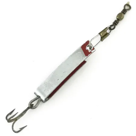 På den vikta metallkroppen finns patentnummer 2 710 272 tydligt stämplat, vilket identifierar denna 1" (2,5 cm) South Bend Super Duper 500 som en klassisk del av amerikansk sportfiskehistoria. Detta exemplar, katalogiserat under produktkod 8642, har den unika U-formade designen som förenar egenskaperna hos ett skeddrag och en spinnare i ett och samma lättviktsredskap. Nickel / Red-finishen ger en ljus, reflekterande utsida som kontrasteras av en tydlig röd rand längs metallens inre böj. Med en vikt på endast 1,4 g (3/64 oz) är draget utrustat med sina originaldetaljer, inklusive en liten trekrok och en mässingstonad lekare med beteslås. Med ett skickbetyg på 5/5 är metallytorna anmärkningsvärt rena och modellbeteckningen "500" förblir tydlig och läsbar mot den polerade nickelytan. Detta USA-tillverkade drag är specifikt konstruerat för kastfiske och tekniker med tunna linor, där det förlitar sig på sin särpräglade geometri och metallfinish för synlighet.