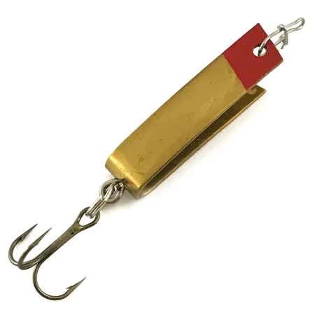Röda färgaccenter pryder huvudet på detta exemplar på 2,3 g (3/32 oz), vilket skiljer det från de vanliga metallvarianterna. Denna South Bend Super-Duper 501, med produktkod 6278, har en karaktäristisk U-formad kroppsdesign som kombinerar egenskaperna hos ett skeddrag och en spinnare. Draget är 3 cm (1 1/4") långt och tillverkat av en enda vikt metallremsa med en blank guldfinish och tillverkarens namn stämplat på insidan. Monteringen inkluderar en vass trekrok fäst via en fjäderring vid den nedre böjen och ett beteslås i metall för linanslutning. Tillverkat i USA, detta drag är i 5/5-skick med en ren, glänsande yta och välbevarad färg. Denna specifika färgkonfiguration är en favorit för de som söker hög kontrast vid finesse-fiske efter rovfiskar.
