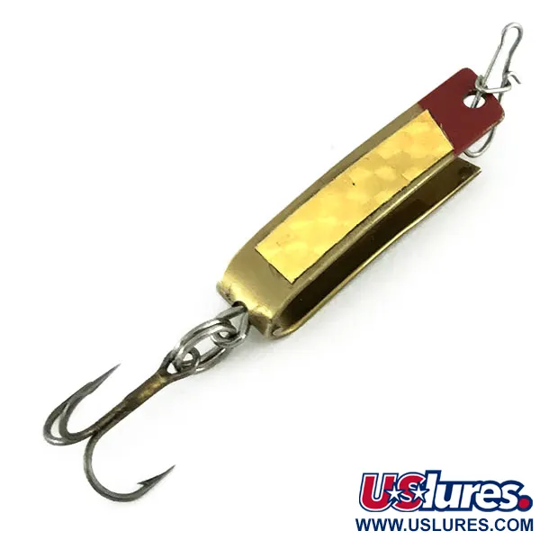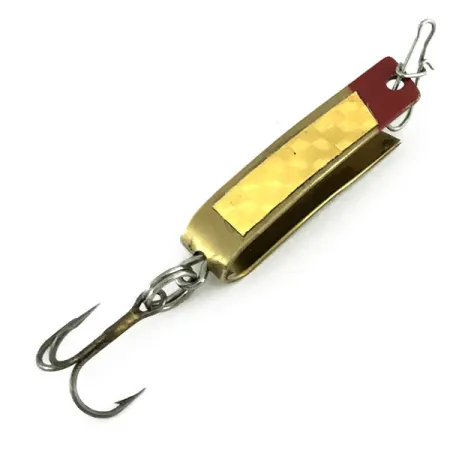 Guldplätering och en livlig röd spets definierar den visuella karaktären hos South Bend Super-Duper 501, som identifieras av produktkod 9537. Med en vikt på 3/32 oz (2,3 g) och ett mått på 1 1/4" (3 cm), har detta USA-tillverkade bete en distinkt U-format vikt metallkonstruktion. En texturerad, holografisk guldfolieremsa är applicerad på ena sidan för att förstärka ljusreflektionen. Exemplaret är i 5/5 skick och uppvisar en ren yta där varumärket 'SUPER-DUPER' är tydligt stämplat i metallen. För hårdvaran är den utrustad med en robust trekrok fäst via en fjäderring och inkluderar en lekare med hake för enkel linanslutning vid huvudet. Den övergripande designen representerar en unik blandning av skeddrag och spinnare, karakteristisk för South Bends tillverkningsmetoder från mitten av seklet.
