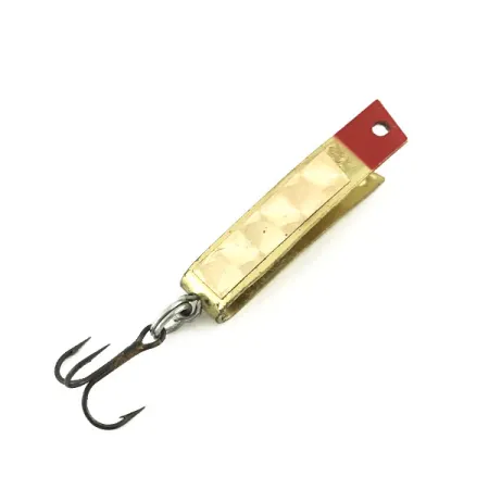 Detta South Bend-exemplar mäter 1 1/4" (3 cm) och har den distinkta U-formen i bockad metall som definierar Super Duper 502. Den guldpläterade utsidan är detaljerad med ett texturerat, diamantliknande facettmönster, kompletterat med en solid rödmålad accent vid linhållaren. Detta drag på 3/32 oz (2,5 g), med produktkod 8616, förenar egenskaperna hos ett skeddrag och en spinnare i en kompakt profil. Baksidan av mässingskroppen är tydligt stämplad med "PAT NO 2,710,478", vilket återspeglar dess historiska ursprung från tillverkning i USA. Exemplaret har kvar hela sin ursprungliga lyster och är i 5/5-skick med ren hårdvara och en vass trekrok säkrad med en fjäderring.