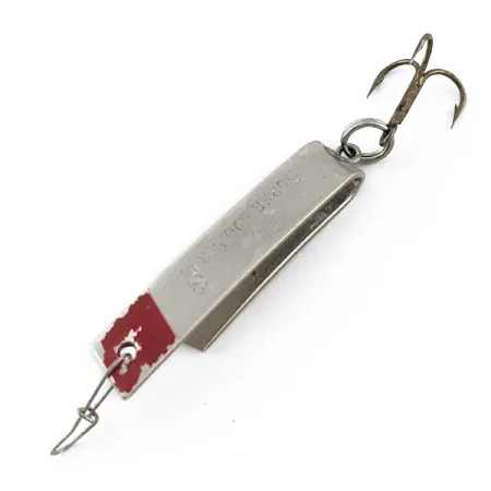 Med en vikt på 4,3 g (1/8 oz) är den distinkta U-formade profilen hos detta Luhr Jensen Super-Duper 503 kännetecknande för dess unika vattenfångande design. Den 3,5 cm (1 1/2") långa nickelkroppen har en tydlig, stämplad modellbeteckning och är prydd med en klassisk röd färgklick nära linfästet. Detta USA-tillverkade drag är registrerat under produktkod 22870 och har kvar sin originaltrekrok och främre trådinfästning. Exemplaret är i skick 4/5, med visst mindre ytslitage på den röda färgdetaljen, medan nickelytan fortfarande är blank och reflekterande. Dess okonventionella form är specifikt utformad för spinnfiske eller trolling med lätta linor, vilket gör det till ett mångsidigt verktyg för öring och abborrfiskar. Den strukturella integriteten hos den bockade metallramen är utmärkt och visar den kvalitetskontroll man förväntar sig av klassiska Luhr Jensen-redskap.