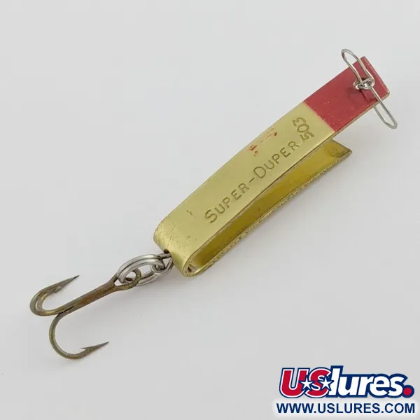En livlig röd spets ger en skarp kontrast mot den guldfärgade metallen på detta klassiska U-formade skeddrag. Direkt stämplat i kroppen finns namnet SUPER-DUPER 503 tillsammans med patentnr 2719378, vilket indikerar dess äkta Luhr Jensen-arv. Detta USA-tillverkade exemplar har svarta bokstäver som förblir skarpa, vilket bidrar till dess 5/5 skick. Den okonventionella vikta designen är konstruerad för att fånga vatten effektivt vid trolling eller kast med lätt lina. All originalutrustning finns kvar, inklusive en trekrok fäst via en fjäderring och ett beteslås i änden för linan. Ofta hittat i utrustningen hos hängivna öring- och abborrfiskare, är denna modell en viktig del av fiskehistorien från mitten av seklet. Guldpläteringen behåller sin ursprungliga glans över hela längden på den vikta metallramen. Denna artikel är katalogiserad under produktkod 24435.