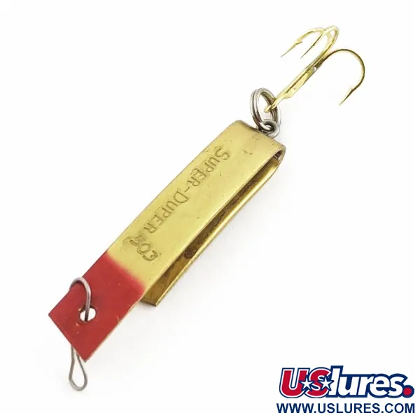 SUPER-DUPER 503-märket, tydligt stämplat i mässingsytan, identifierar denna 3,5 cm långa klassiker från Luhr Jensen. En livlig röd spets kontrasterar mot den polerade guldytan och skapar ett synligt mål för öring eller abborre. Dess karakteristiska U-formade profil är konstruerad av ett enda stycke bockad metall, en design som har varit en stapelvara i fiskelådor i decennier. Med en vikt på 4,3 g är detta exemplar dimensionerat för kast med lätta linor eller långsam trolling i klart vatten. Detta specifika bete håller ett utmärkt skick på 5/5, vilket visar guldpläteringens ursprungliga lyster och den röda färgens skärpa. Linfästet sitter i den rödmålade änden, medan den guldfärgade trekroken hänger baktill.