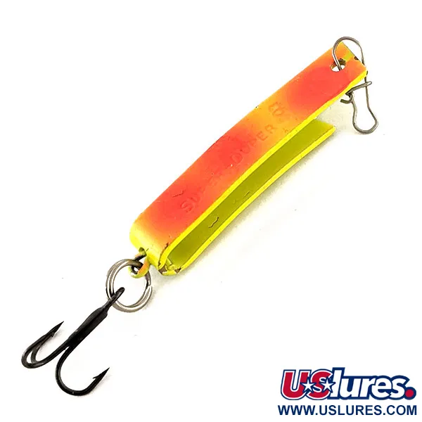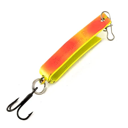 Självlysande egenskaper definierar finishen på denna South Bend Super-Duper 503 UV, vilket gör den till ett specialiserat val för djupt vatten eller mulna dagar. Identifierad med produktkod 12421, har detta bete en unik U-formad vinklad metallkropp som kombinerar egenskaperna hos både en spinnare och ett skeddrag. Den livfulla färgen övergår från en ljus chartreuse till en mättad orange, med den UV-reaktiva beläggningen som ger hög synlighet under dåliga ljusförhållanden. Detta specifika exemplar är oanvänt och framstår i nyskick med sin ursprungliga fabriksfinish och stämplade markeringar helt intakta. En vass svart trekrok är fäst vid stjärten via en fjäderring, medan ett beteslås i tråd är förmonterat vid huvudet för enkel linafästning.