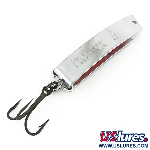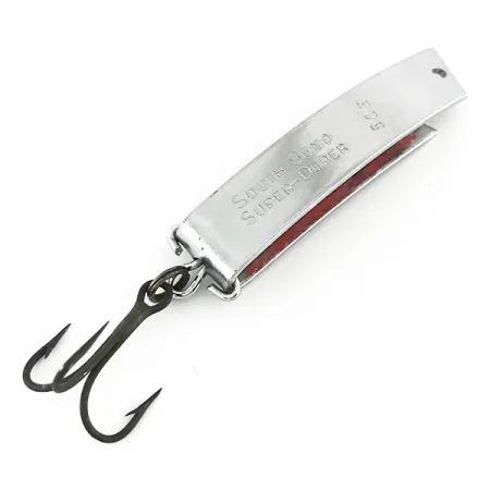 Präglad med "South Bend SUPER-DUPER 506" på ovansidan, har detta 4,5 cm (1 3/4") drag den karakteristiska U-formade metallformen som har varit en stapelvara i fiskelådor i generationer. Med en vikt på 7 g (1/4 oz) är exemplaret försett med en blank förnickling på utsidan, medan den inre kurvan är belagd med en klar röd färg för att ge en visuell profil med hög kontrast. På insidan är "PAT. PEND."-markeringen tydligt synlig, en teknisk detalj som identifierar den som en tidig produktionsserie från South Bend. Maskinvaran består av en enkel trekrok fäst vid en fjäderring i bakkanten, vilken är i utmärkt skick. Detta specifika exemplar är klassat som 5/5 och uppvisar en mycket slät metallyta och anmärkningsvärt välbevarad invändig färg. Detta USA-tillverkade drag med produktkod 8512 är byggt för spinnfiske och trolling och representerar ett unikt designtänk för metalldrag från mitten av århundradet.