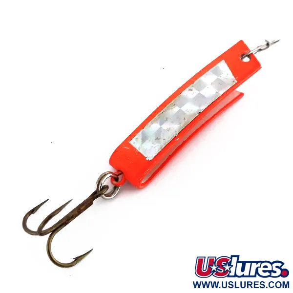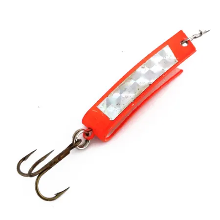 Fluorescerande orange färg täcker den U-formade kroppen på detta 4,5 cm långa exemplar, vilket ger hög synlighet under olika vattenförhållanden. Super-Duper 506 UV (produktkod: 9851) väger 7 g och har ett karaktäristiskt prismatiskt tejp-inlägg som ger reflexer från flera vinklar. Denna specifika South Bend-modell är designad med UV-reaktiva egenskaper, vilket gör att draget lyser kraftigt när det utsätts för ultraviolett ljus. Konstruktionen är uppbyggd kring ett enda stycke bockad metall, ett signum för den USA-tillverkade Super-Duper-serien som är avsedd för mångsidigt kastfiske och trolling. En trekrok är fäst baktill via en robust fjäderring, medan den främre linöglan är ett enkelt, stansat hål. Draget har betyget 5/5 och är i utmärkt skick, utan synligt slitage på den fluorescerande lacken eller det holografiska inlägget. Den metalliska U-formen är konstruerad för att behålla sin struktur vid hugg samtidigt som den ger en slank profil.