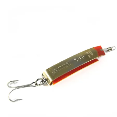 De tydliga markeringarna 'South Bend Super-Duper 509' stämplade i metallen identifierar detta 2 1/4" (5,5 cm) långa bete som en del av amerikansk sportfiskehistoria. Den karaktäristiska U-formade profilen har en guldpläterad utsida som kontrasteras av en livfull rödmålad insida, en kombination designad för synlighet vid kast eller trolling. Exemplaret väger 11 g (2/5 oz) och har den interna produktkoden 0507. Skicket 4/5 återspeglar ett rent utseende, där den stämplade texten med 'PAT'D' och 'USA' förblir skarp och läsbar mot guldfinishen, medan den röda färgen inuti böjen visar mindre spår av lagring. Monteringen består av en silverfärgad trekrok fäst via en fjäderring, med ett beteslås monterat i den motsatta änden.