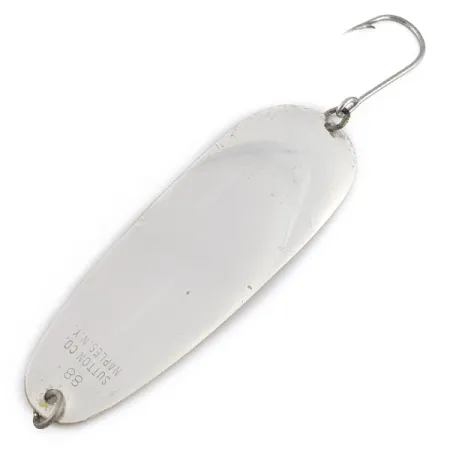 Silverplätering på ena sidan och en guldtonad mässingsfinish på baksidan ger ett mångsidigt blänk som har lurat fiskar i generationer. Med en längd på 9 cm (3 1/2") och en vikt på 7 g (1/4 oz) tillåter den extremt tunna mässingskonstruktionen den specifika darrande gången som har gjort Sutton-beten legendariska bland öring- och lax-fiskare. Stämplingen ”88 SUTTON CO. NAPLES, N.Y.” är fortfarande tydlig på silversidan, vilket identifierar dess ursprung och produktkod 22946. Detta exemplar är riggat med en enkelkrok fäst via en fjäderring, en konfiguration som föredras för sina pålitliga krokningar och minskad risk för bottennapp vid trolling på grunt vatten. Med sina rena ytor och intakta komponenter håller betet ett stabilt skick på 4 av 5. Det representerar den subtila, realistiska presentation som krävs för framgång i kristallklart vatten där tyngre skeddrag ofta misslyckas med att leverera.
