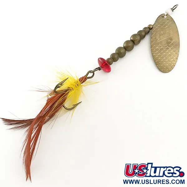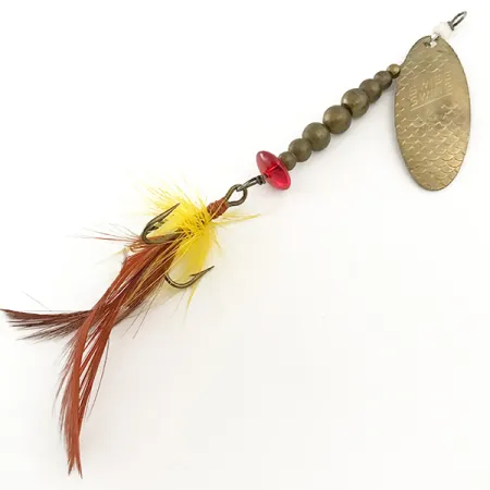 Graderade mässingspärlor pryder trådaxeln på denna fransktillverkade inline-spinnare, vilket ger en distinkt viktprofil och klassisk estetik. Det ovala mässingsbladet är präglat med namnet Swiss Swing och har ett texturerat fjällmönster över ytan för unika reflektioner. Detta exemplar, med produktkod 6645, väger 1/4 oz (7 g) och mäter 3 1/4" (8,5 cm) i längd, vilket gör den till ett utmärkt val för öring eller abborre. En fasetterad röd pärla fungerar som blickfång precis ovanför den fjäderklädda trekroken, som är klädd i en kombination av gult och brunt hackel. En liten vit pärla vid den övre öglan underlättar en smidig rotation av bygeln vid jämn invevning. Detta vintagebetet är i utmärkt skick med betyget 5/5. Komponenterna är blanka och fjäderdressingen är fyllig och säkert surrad med röd tråd.