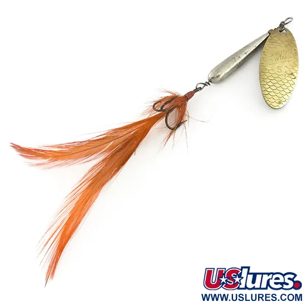 Med en total längd på 8 cm (3 1/4") ger det mässingsfärgade spinnarbladet med fjällmönster en distinkt textur som fångar ljuset annorlunda än en slät finish. En klarorange hackelfjäder är noggrant bunden runt trekroken på detta fransktillverkade exemplar, listat med produktkod 9438. Den förnicklade droppformade kroppen ger den vikt på 9 g (1/3 oz) som krävs för stabila kast. Renosky Lures lanserade dessa europeiska designer på marknaden, och bladet är tydligt stämplat med 'Swiss Swing 5', vilket visar dess ursprung. Varje komponent är i utmärkt skick, och metallytorna samt fjäderbeklädnaden framstår som mycket välbevarade, vilket ger betyget 5/5. Trådkonstruktionen är rak och bygeln gör att mässingsbladet sitter korrekt mot nickelkroppen.