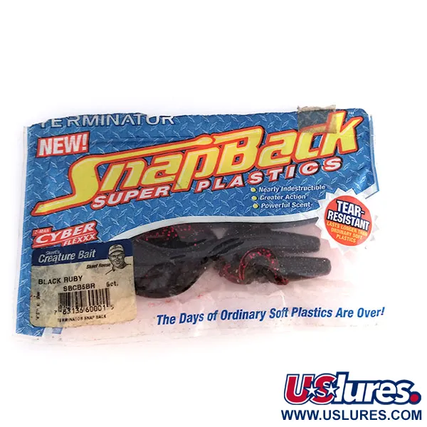 Dessa 4" (10 cm) gummibeten kommer från de ursprungliga fabrikerna i USA och representerar en märkbär era i den amerikanska jigghistorien. Den djupa Black Ruby-finishen på Terminator Snapback Creature har en mörk, opak bas som är kraftigt fylld med rött glitter som fångar ljuset genom dess genomskinliga bihang. Detta paket med produktkod 9826 innehåller tre exemplar i oanvänt skick som bibehåller sin ursprungliga elasticitet och fabrikstextur. Designen har en kraftigt räfflad kropp följt av två par krullande stjärtar och en kluven stjärtände, en konfiguration som är typisk för creature-beten fokuserade på att flytta vatten. Även om Terminator är mest känt för sina wire-beten, skapades dessa silikonbeten specifikt för specialiserade jiggtekniker där hållbarhet var ett primärt krav. Varje del i setet är i nyskick med betyget 6 för konservering.