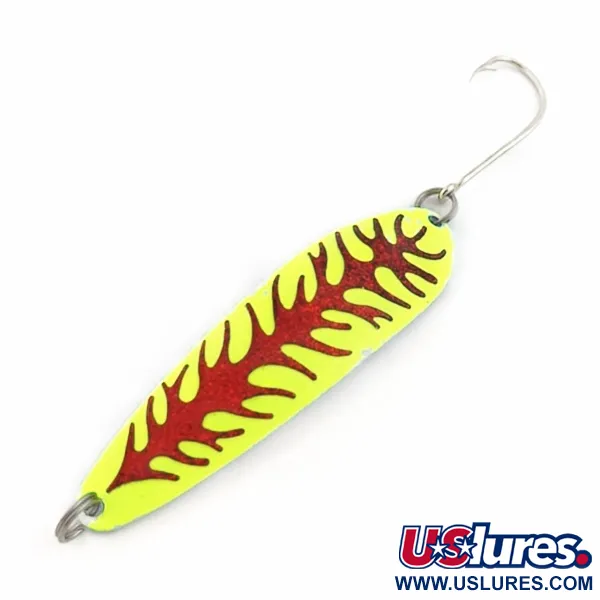 Klar chartreusegul färg utgör en högvisuell bas för det distinkta röda glittermönstret på detta USA-tillverkade skeddrag för spinnfiske. Med en längd på 9 cm och en vikt på 8 g representerar The Producers Hookster Totem #4 en specifik era av amerikanskt hantverk från varumärket Producers. Draget har ett djuprött, ryggradsliknande mönster med en metallisk glitterfinish som ger en skarp kontrast mot den helgula kroppen. Detta bete, identifierat med produktkod 23795, är i skick 5/5 med en ren yta och originalkomponenter. Utrustningen består av en enkelkrok i rostfritt stål monterad med en fjäderring i aktern, samt en fjäderring i nosen för säker lininfästning. Den slanka profilen är utformad för mångsidig användning vid både spinnfiske och trolling under varierande ljusförhållanden.