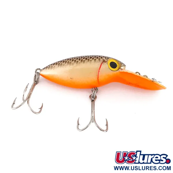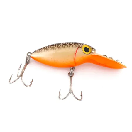 Orange dominerar den nedre halvan och övergår i ett vackert återgivet silver- och guld-fjällmönster över den välvda ryggen. Denna Willy’s Worm, tillverkad av The Producers i USA, har produktkod 9588 och är i 5/5-skick. Betet mäter 2" (5 cm), väger 1/4 oz (8 g) och har en karakteristisk överdimensionerad sked för djupt fiske. De stora gula ögonen med framträdande svarta pupiller är ett signum för denna modell och ger en tydlig fokalpunkt mot den strukturerade fjällfinishen. Originalutrustningen inkluderar två silverfärgade trekrokar, en monterad på buken och en vid stjärten. Ett förmonterat beteslås på den breda, rundade skeden säkerställer att betet är i nyskick från fabrik. Övergången från den ljusorangea buken till den mörkare, metalliska ovansidan speglar den höga tillverkningskvaliteten från eran.
