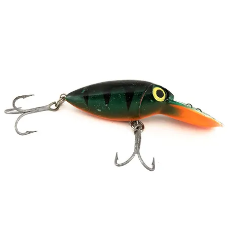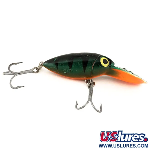 Gröna vertikala ränder mot en mörkt olivgrön rygg definierar den visuella profilen hos denna The Producers Willy's Worm UV, en klassisk amerikansk raritet. Med en vikt på 8 g (1/4 oz) har detta 5 cm (2") exemplar en livlig orange buk som sträcker sig framåt och bildar en bred, integrerad sked. De gula ögonen med svarta pupiller ger en tydlig kontrast mot det gröna huvudet. Katalogiserat under produktkod 11232, utmärker sig detta bete genom sin UV-reaktiva finish på ränderna, designad för att fånga ljus i varierande vattenförhållanden. Hårdvaran består av två trekrokar i rent skick. Färgövergången mellan den djupgröna ovansidan och den ljusorange undersidan är skarp, vilket bidrar till dess skickbetyg på 4/5. Varje detalj, från den rundade kroppsformen till den specifika ögonplaceringen, speglar den design som är karakteristisk för The Producers.
