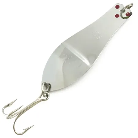En pressad mittrygg definierar profilen på detta trollingdrag och skiljer det från de tjockare standardmodellerna i serien. Detta exemplar från Prescott Spinner, känt som Thin Doctor 165 (Produktkod 5682), mäter 6,5 cm (2 1/2") och väger lätta 4 g (1/8 oz). Den blanka nickelfinishen på metallkroppen pryds av tre tydliga röda prickar placerade nära den övre fjäderringen, vilket ger en visuell accent mot den reflekterande ytan. Draget är tillverkat i USA och är särskilt utformat för trolling där en tunnare profil föredras. Utrustningen inkluderar en vass trekrok fäst med en fjäderring i akteränden. Skicket är 5/5 och nickelpläteringen håller en hög lyster över hela den långsmala droppformen.