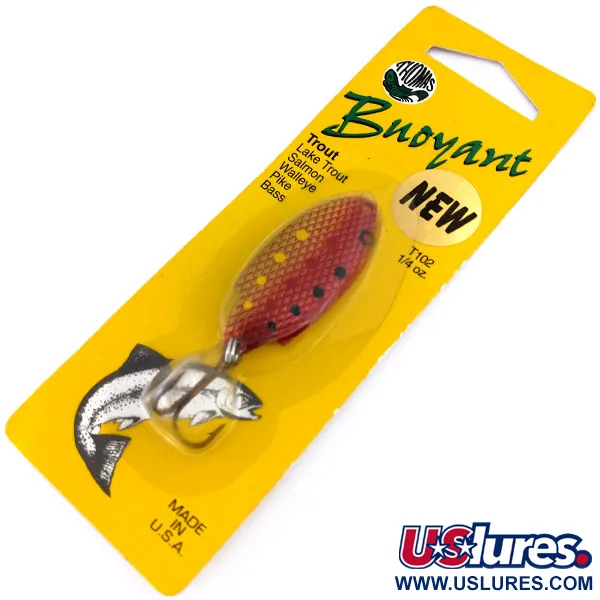 Ett livfullt guld- och rött fjällmönster definierar kroppen på detta skeddrag, accentuerat av tydliga gula och svarta prickar över dess böjda yta. Med måtten 1 3/4" (4,5 cm) och en vikt på 1/4 oz (7 g) förblir detta Thomas Buoyant oanvänt i sin ursprungliga gula förpackning, som bär produktkoden T102GR (även identifierad som 10250). Tillverkat av Thomas Spinning Lures, Inc. i Hawley, PA, har denna amerikanska klassiker en robust trekrok och en konstruktion i stansad metall som lämpar sig för spinnfiske eller trolling. Framsidan av kortet listar olika målarter, inklusive öring, lax och gös, medan ett gyllene 'NEW'-klistermärke framhäver dess oanvända vintageskick. På baksidan beskriver instruktionerna tekniker för strömfiske, som att låta betet 'vingla' nära botten för att nå rätt djup för olika ädelfiskar. Detta exemplar har kvar sin ursprungliga finish och krok då det aldrig har använts.