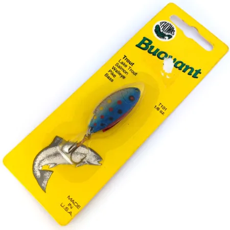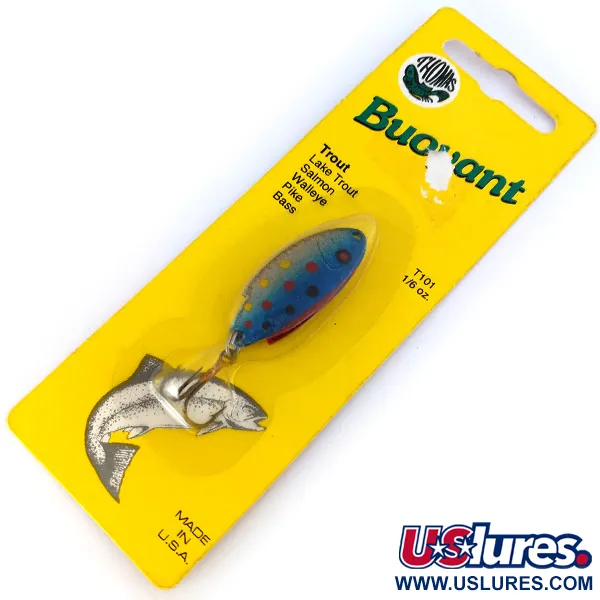 Livliga prickar i rött, gult och svart pryder Blue Trout-finish (blåöring) på detta 4 cm (1 1/2") skeddrag i metall. Denna Thomas Buoyant, med produktkod 10659, väger 5 g (3/16 oz) och återspeglar ett designarv som sträcker sig tillbaka till varumärkets patent från 1946. Det Hawley, PA-baserade företaget Thomas Spinning Lures fokuserade på plätering av smyckeskvalitet för att skapa ett högkontrasterande blänk. Som ett oanvänt exemplar behåller draget sin ursprungliga fabriksglans helt utan tecken på slitage. Draget är utrustat med en enkel trekrok och är avsett för olika tekniker, inklusive kastfiske efter öring eller trolling efter lax och gädda. Monterat på sitt ursprungliga gula displaykort sitter draget kvar ovanför den klassiska illustrationen av en hoppande öring.