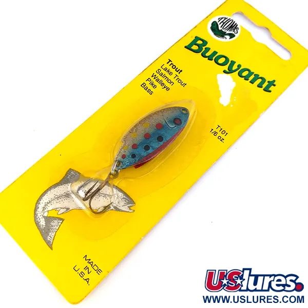 Detta skeddrag i Blue Trout-finish med levande röda och blå prickar är en klassiker i amerikansk fiskehistoria. Draget väger 5 g (3/16 oz) och mäter 4 cm (1 1/2") i längd. Det har en unik elritsliknande form med en distinkt böj för att reflektera ljuset optimalt. Just detta exemplar har produktkod 10661 och är oanvänt i sin ursprungliga gula blisterförpackning. Thomas Spinning Lures patenterade designen redan 1946, och dess popularitet bland öring- och laxfiskare beror främst på ytfinishen av smyckeskvalitet. Förpackningens baksida framhåller dess effektivitet för arter som gös och gädda vid måttligt långsam invevning. Skeddraget är tillverkat i USA och utrustat med en kraftig trekrok. En fabriksdekal på baksidan identifierar varianten som T101B-BB, vilket bekräftar färgskalan i silver och blått.