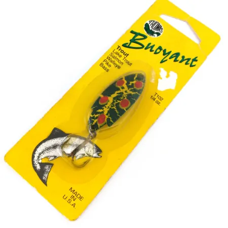 Detta skeddrag mäter 4,5 cm (1 3/4") och har det karaktäristiska mönstret "Red Dot Frog" som är känt för sin goda synlighet. Med en vikt på 7 g (1/4 oz) identifieras detta exemplar med produktkod T102FRG (10836) och levereras i sin gula originalblisterförpackning. Betet är oanvänt, ett fint tillskott till samlingen, och har skicket 5/5. Färgsättningen består av en mörkgrön och gul spräcklig bakgrund med fem stora, cirkulära röda prickar. Detta drag tillverkades av Thomas Spinning Lures, Inc. i Hawley, PA, och originalförpackningen lyfter fram dess mångsidighet för arter som öring, lax och gädda. Betet är utrustat med en enkel trekrok i stjärten. Detaljerade instruktioner på baksidan ger tips om specifika kast- och invevningstekniker för både strömmande vatten och sjöar, med särskilt fokus på hemtagning nära bottenstrukturer.