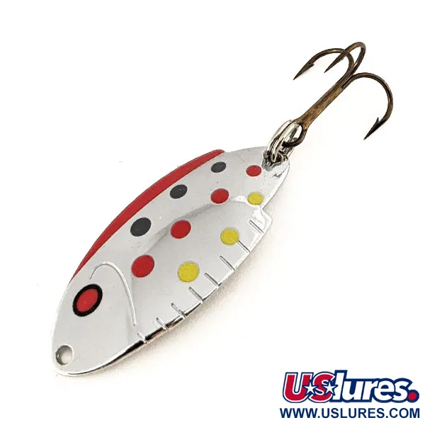 Förnicklingen fungerar som bas för ett klassiskt mönster av röda, svarta och gula prickar på framsidan av detta 4 cm (1 1/2") långa drag. Med en vikt på 5 g (3/16 oz) har detta Thomas Buoyant (produktkod 11248) den traditionella skedform som har definierat det amerikanska öringsfisket i generationer. Baksidan visar tydligt tillverkarens namn och 'BUOYANT'-stämpeln, djupt pressad i metallen. En tydlig röd accent följer den yttre kurvan, medan framsidan är detaljerad med ett stiliserat öga. Trekroken och fjäderringarna är blanka och vassa, vilket återspeglar dess 5/5-skick. Detta USA-tillverkade exemplar behåller sin högpolerade lyster över hela kroppen, och färgen är fortfarande skarp och livfull.