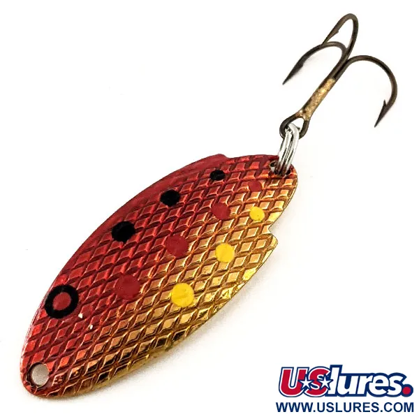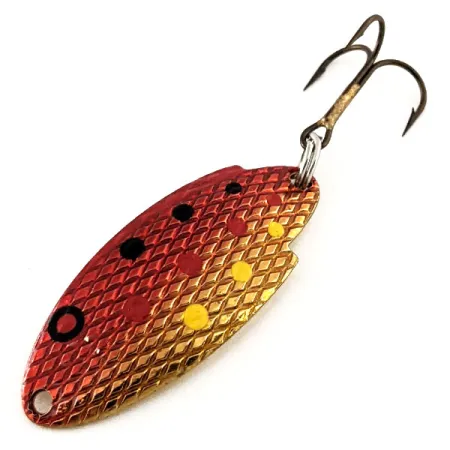 Hamrade texturer på "Rainbow Hammered Red"-finishen skapar ett flerdimensionellt skimmer som har definierat Thomas Buoyant-serien i årtionden. Med en längd på 38 mm (1 1/2") är den distinkt puckelryggiga formen på detta USA-tillverkade skeddrag en klassiker för öring- och lax-fiskare. På den polerade baksidan i guldfinnish finns stämpeln "THOMAS 1/6 oz BUOYANT", även om just detta exemplar är katalogiserat som 5,3 g (3/16 oz) under produktkod 11696. Ovansidan har en djup röd gradient som övergår i guld, dekorerad med en sekvens av svarta, röda och gula prickar. Hårdvaran är i utmärkt skick, med en stark trekrok fäst via en robust fjäderring. I ett skick betygssatt 5/5 behåller draget sin ursprungliga lyster och skarpa detaljrikedom.