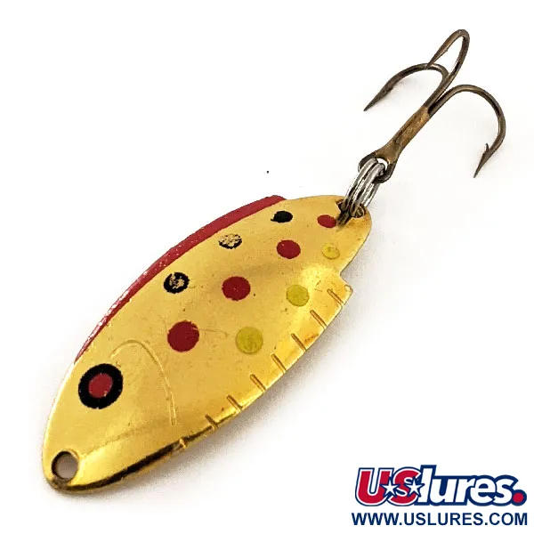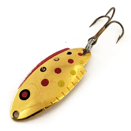 Mönster av guldöring karaktäriserar detta klassiska amerikanska skeddrag, som har en blank guldpläterad finish dekorerad med röda, gula och svarta prickar. Med en vikt på 3/16 oz (5 g) och en längd på 1 1/2" (4 cm) är detta Thomas Buoyant ett ikoniskt stycke amerikansk sportfiskehistoria. Den konvexa sidan är detaljerad med en målad röd kant och små fördjupningar som liknar fiskfenor, vilket höjer det visuella värdet för både samlare och sportfiskare. På baksidan är metallen stämplad med varumärket Thomas och modellbeteckningen T101. Detta exemplar, identifierat med produktkod 11974, håller skicket 5/5 där guldytan och de målade detaljerna är exceptionellt välbevarade. Draget är designat för spinnfiske eller trolling och är utrustat med en vass trekrok fäst via en kraftig fjäderring.