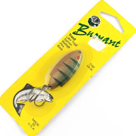 Med en längd på exakt 4,5 cm (1 3/4") har Thomas Buoyant det klassiska abborrmönstret med mörka vertikala ränder mot en mässingsguldfärgad bakgrund. Detta exemplar har produktkod 22043 och är ett oanvänt exempel på amerikanskt hantverk, fortfarande i sin originalförpackning av gul papp. Med en vikt på 7 g (1/4 oz) är skeddraget tillverkat med en finish av högsta kvalitet, designad för att reflektera ljus och efterlikna en flyende bytesfisk. En klar röd ögonpunkt är placerad nära det rundade huvudet, medan den bakre änden är utrustad med en vass trekrok. Tillverkad av Thomas Spinning Lures i Hawley, Pennsylvania, återspeglar den en design som patenterades första gången 1946. Förpackningen nämner dess effektivitet för arter som öring, lax och gös, vilket understryker dragets mångsidiga konstruktion.