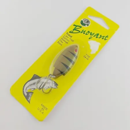 Abborrmönstret med dess distinkta svarta ränder och röda ögondetalj gör att detta exemplar verkligen sticker ut på sitt gula vintage-pappark. Detta amerikansktillverkade skeddrag väger 7 g och mäter 4,5 cm. Med produktkod 24095 är det en stapelvara för fiske efter öring, lax och gädda. Designen är en direkt efterföljare till det ursprungliga patentet från 1946, med en finish av högsta kvalitet skapad för att imitera en flyende betesfisk. Betet levereras i sin originalförpackning, är oanvänt och i nyskick med blanka komponenter och en skarp färgåtergivning. Thomas rekommenderade historiskt en långsam invevning eller trollinghastighet för att betet effektivt ska efterlikna ett bytesdjurs rörelser. Förpackningen bär den klassiska Thomas Buoyant-logotypen och framhäver dess effektivitet för allt från gös till abborre.