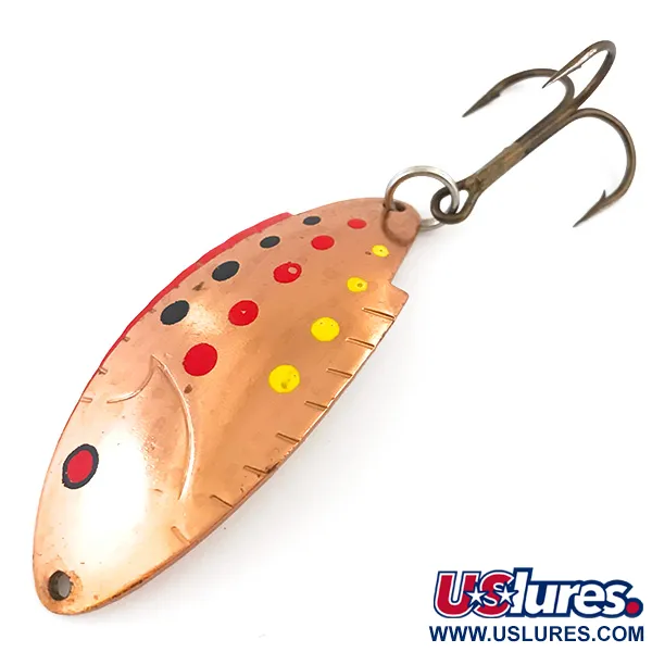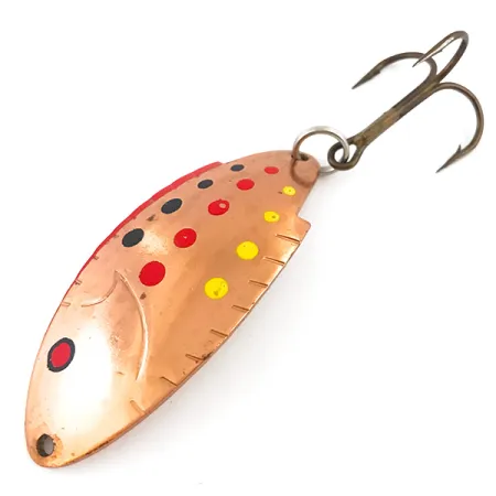 Tydligt stämplad på baksidan av den böjda metallkroppen, identifierar märket 'THOMAS BUOYANT' och beteckningen 'PAT PEND' detta 6 cm långa skeddrag som en stapelvara i amerikansk tackelhistoria. Den varma kopparbasen är dekorerad med en serie livfulla röda, svarta och gula prickar, ett klassiskt färgmönster designat för hög synlighet under olika vattenförhållanden. Skeddraget väger 14 g och dess kraftiga gods är kombinerat med distinkta skåror längs ena kanten som efterliknar silhuetten av en ryggfena. Hårdvaran består av en robust fjäderring och en bronserad trekrok, båda i strukturellt gott skick. Klassat i skick 5/5 presenterar sig dragets framsida vackert med skarp färg, medan baksidan visar några lätta ytmarkeringar och mindre åldersfläckar som vittnar om dess vintagestatus. Detta USA-tillverkade exemplar uppvisar de hållbara tillverkningsstandarder som är typiska för märket Thomas.