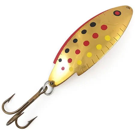Stämplad med modellbeteckningen "T105" och "THOMAS BUOYANT" på den konkava sidan, representerar detta skeddrag ett klassiskt stycke amerikansk sportfiskehistoria från USA. Golden Trout-finish är särskilt slående, med en polerad guldbas dekorerad med rader av röda, svarta och gula prickar som efterliknar den levande flanken hos en öring. Med måtten 8,5 cm (3 1/4") och en vikt på 21 g (3/4 oz), bär detta bete, identifierat med produktkod 4931, en betydande profil för sin storlek. Mässingskroppen har karakteristiska etsade gäl- och fenlinjer längs den bakre kanten, vilket ger strukturella detaljer till blänket. En robust trekrok är säkrad med en ren fjäderring, vilket återspeglar den hållbara hårdvara som förväntas från Thomas. När det gäller skick får exemplaret 5/5, med en spegelblank finish och distinkt färgapplicering. Även om baksidan av betet är stämplad 5/8 oz, gör dess faktiska vikt på 21 g (3/4 oz) det till ett mångsidigt verktyg för både långdistanskast och trolling.