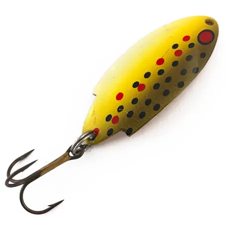 Identifieringsmärkningen THOMAS T102 BUOYANT 1/4 OZ är tydligt instämplad i den guldpläterade baksidan och fastställer identiteten på detta klassiska amerikansktillverkade skeddrag. Framsidan är lackerad i ett levande Yellow Trout-mönster, med en gradientbas från gult till guld prydd med svarta och röda prickar. En stor röd cirkulär punkt nära det övre fästet fungerar som ett primärt visuellt blickfång. Metallkroppen mäter 4,5 cm (1 3/4"), väger 7 g (1/4 oz) och bär produktkoden 4960. Detta exemplar är i skick 5/5, med en ren yta och originalkomponenter, inklusive en stark fjäderring och en bronserad trekrok. Konstruktionen återspeglar den höga standarden hos Thomas-beten, med en välvd profil speciellt utformad för spinnfiske eller trolling i sötvatten.