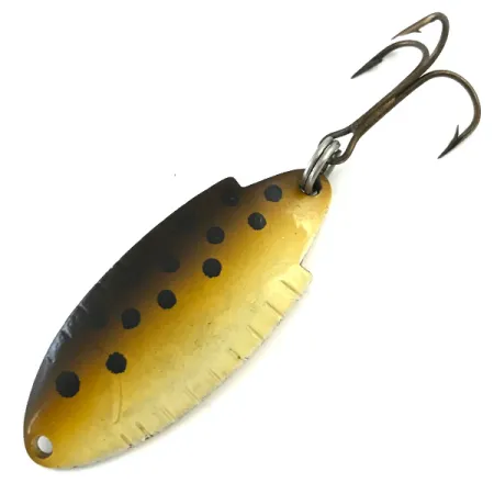 Färgmönstret Golden Trout, med en mörkbrun gradient längs ryggen som övergår i en levande guldfärgad buk, definierar finishen på detta drag. På baksidan finns modell T102 tydligt stämplad, vilket identifierar det som ett 7g (1/4oz) skeddrag från Thomas Spinning Lure Company. Med en längd på 4,5 cm (1 3/4") accentueras skeddragets profil av vågformade skåror längs underkanten och precisionsplacerade svarta prickar. En robust trekrok i bronsfinish är monterad med en fjäderring i rostfritt stål, vilket gör det lämpligt för spinnfiske i strömmar eller trolling i djupa sjöar. Skicket på denna USA-tillverkade klassiker är 5/5, med en ren yta och skarpa detaljer. Namnet Buoyant och vikten är djupt präglade, vilket vittnar om tillverkningsstandarden för produktkod 5391. Denna viktklass föredras ofta vid fiske efter öring och abborrfiskar när en mindre profil krävs.