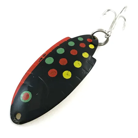 Namnet "THOMAS BUOYANT" är stansat i den gulmålade undersidan och är skarpt och läsligt på detta 1 3/4" (4,5 cm) skeddrag i metall. Detta specifika exemplar, identifierat med produktkod 5545, bär det ikoniska Black Trout-mönstret – en mörk finish dekorerad med en rytmisk sekvens av gröna, röda och gula prickar. Draget väger 1/4 oz (7 g) och är i exceptionellt skick, graderat 5/5, med en ren yta och välbevarad färg. Konstruktionen har en svag offset-böjning och en sidofen-detalj som skapar en specifik profil i vattnet, en signaturdesign för Thomas-företagets USA-tillverkade beten. Monteringen inkluderar en robust fjäderring baktill som håller en blank silverfärgad trekrok, medan ett enskilt hål i nosen fungerar som fästpunkt för spinnfiske eller trolling.