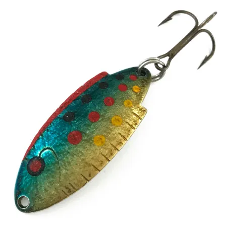 Ett levande regnbågsmönster är handmålat på den konvexa sidan av detta klassiska skeddrag, som har en slående krickblå rygg och en glänsande guldkropp. Vikten på 1/4oz (7g) gör det till ett mångsidigt val för kastfiske i bergsbäckar eller trolling i djupare vatten. Med en längd på 1 3/4" (4,5 cm) har mässingskroppen en distinkt skårad stjärt och djupt präglade fjällinjer längs den nedre kanten. På baksidan är den polerade nickelfinishen exceptionellt ren och bär den ursprungliga Thomas T102-modellstämplingen och namnet "BUOYANT". Detta exemplar, listat under produktkod 5603, har ett skickbetyg på 5/5 och uppvisar anmärkningsvärt välbevarade röda, gula och svarta prickar över den fjälltexturerade ytan. Komponenterna består av en stark fjäderring och en vass trekrok, vilket återspeglar kvaliteten hos dess USA-tillverkade arv.