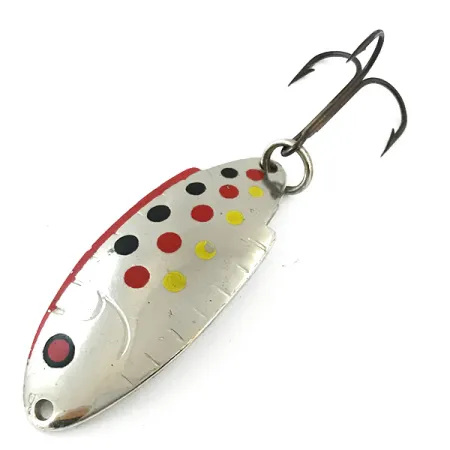 Nickelpläteringen ger den grundläggande glansen för det flerfärgade mönstret med röda, svarta och gula prickar som dekorerar detta skeddrag på 7 g (1/4 oz). På baksidan förblir den stämplade texten ”THOMAS BUOYANT” skarp och läsbar mot den polerade ytan, ett kännetecken för amerikansk tillverkning från denna era. Denna specifika modell på 4,5 cm (1 3/4"), identifierad med produktkod 5604, har karakteristiska hackade kanter och en tydlig rödmalad rygg som kontrasterar mot den blanka nickelkroppen. Monteringen består av en robust fjäderring och en mörkfärgad trekrok, båda bevarade i utmärkt skick. Med ett skick betygat till 5/5 visar draget upp den livfulla finish i flera toner som samlare förväntar sig. Designen är avsedd för spinnfiske eller trolling, med en vikt som är balanserad specifikt för dess karaktäristiska flytkraft.