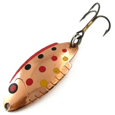 Stämpeln "THOMAS TIG BUOYANT" på baksidan av kopparkroppen fungerar som ett kännetecken för denna amerikanska klassiker. Detta exemplar, med produktkod 5619, mäter 4 cm (1 1/2") och väger 5 g (3/16 oz). Mönstret Copper Trout är minutiöst applicerat och visar svarta, röda och gula prickar över en polerad kopparbas. Distinkta skåror är utskurna längs den nedre böjda kanten, ett signaturdesignelement för Thomas-serien. Draget är utrustat med en vass trekrok fäst via en fjäderring. I ett skick som betygsatts till 5/5 är kopparytan fortfarande blank och de målade detaljerna är skarpa och intakta.