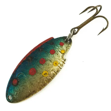 Präglad med modell-ID T101 och namnet Buoyant på sin polerade silverbaksida är detta 4 cm (1 1/2") skeddrag en klassiker i amerikansk fiskehistoria. Draget väger 5 g (3/16 oz) och är byggt på en texturerad, hamrad metallkropp med ett klassiskt regnbågsmönster. Finishen inkluderar en blågrön gradient längs ryggen och en serie livfulla röda och gula prickar över en guldtonad bas. Identifierad med produktkod 5644 är detta exemplar i skick 5/5, med skarpa detaljer i både färg och den djupt präglade texten på baksidan. Draget är utrustat med en bronserad trekrok fäst via en enkel fjäderring i den smala änden. Designad av Thomas för spinnfiske och trolling, ger tvåtonskonstruktionen ett högkontrasterande blänk mellan den färgglada framsidan och den blanka silverundersidan.