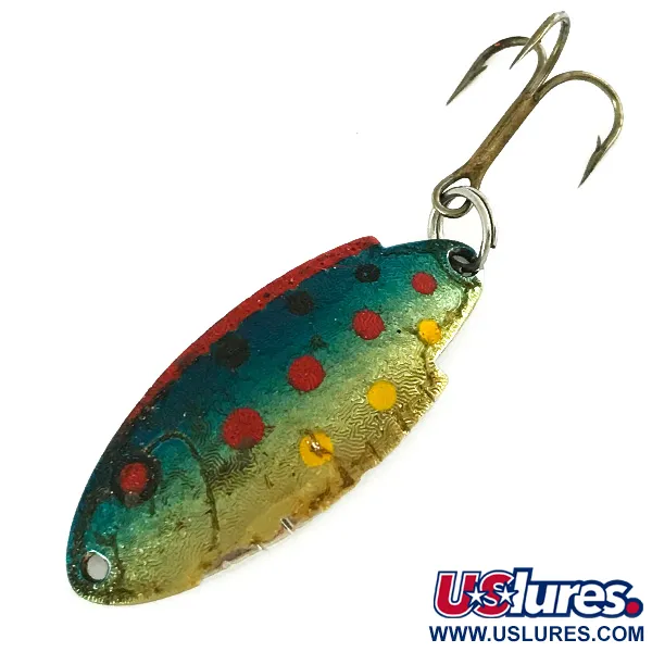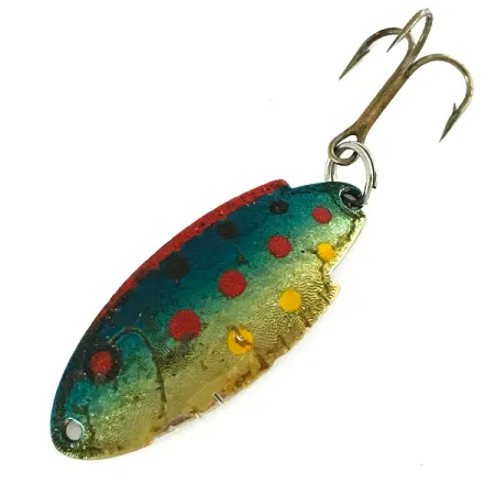 På den polerade silverfärgade baksidan finns orden "THOMAS BUOYANT" tydligt stämplade, vilket identifierar arvet från detta 4 cm (1 1/2") långa drag. Detta specifika exemplar, katalogiserat med produktkod 7226, har finishen Blue Trout, ett detaljerat mönster med en gradient från kricka till guld punkterad av distinkta röda och gula prickar. Med en vikt på 5 g (3/16 oz) representerar skeddraget klassisk USA-tillverkad sportfiskekonstruktion. Hårdvaran består av en bronsfärgad trekrok och en robust fjäderring i metall. Med ett skick på 5/5 förblir färgen exceptionellt ljus, och de stämplade tekniska detaljerna på baksidan är helt läsbara. En tunn linje med röd färg löper längs skeddragets överkant, vilket ger en skarp kontrast mot kroppens blå och gröna nyanser.