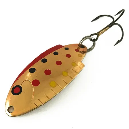 Gnistrande kopparplätering utgör grunden för Golden Trout-finishen på denna T102-modell, som har distinkta röda, gula och svarta prickar över ytan. På baksidan finns tillverkarens detaljer "THOMAS BUOYANT" och vikten 1/4 oz (7 g) tydligt instämplade, vilket identifierar det som ett genuint USA-tillverkat redskap. Detta exemplar, med produktkod 7228, mäter exakt 4,5 cm (1 3/4") i längd och är i ett utmärkt skick på 5/5, utan tecken på användning på den polerade metallen eller den ursprungliga trekroken. Konstruktionen inkluderar ett skårat gälområde nära stjärten och en böjd profil som har gjort denna design till en stapelvara för öring- och laxfiskare i årtionden. Hårdvaran, monterad via en kraftig fjäderring, förblir blank och fri från oxidation. Den lilla öglan framtill är exakt borrad, redo för ett beteslås eller direkt knut för kast i strömmande vatten.