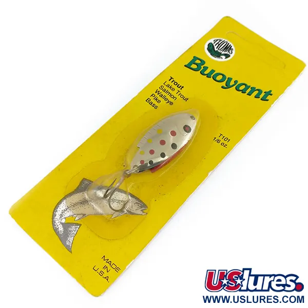 Polerad nickelplätering utgör basen för det tydliga mönstret av röda och gula prickar på detta klassiska Thomas Buoyant skeddrag. Detta exemplar med produktkod 9675 väger 3/16 oz (5 g) och har en kompakt längd på 1 1/2" (4 cm). Det är oanvänt i sin ursprungliga gula förpackning, vilket bevarar finishen och krokarna i ett 6/5-skick. Draget är tillverkat i USA och har en asymmetrisk form specifikt utformad för spinnfiske eller trolling i sötvatten efter arter som öring, lax och abborre. Förpackningen framhåller dess effektivitet för gös, gädda och kanadaröding, medan dragets baksida är utrustad med en lysande röd lockskiva fäst vid trekroken. Denna klassiska färgkombination är designad för att maximera synligheten under olika vattenförhållanden och återspeglar de långvariga produktionsstandarderna hos varumärket Thomas.