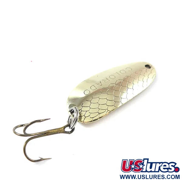 Djupt präglade fjäll täcker bladets konvexa sida, vilket ger en klassisk textur som effektivt fångar ljuset under ytan. Med en längd på exakt 4 cm (1 1/2") har skeddraget en rik guldfinish som är enhetlig över hela mässingskroppen. Ordet "COLORADO" är tydligt stämplat på den fjällmönstrade sidan, medan baksidan visar Thomas tillverkarens logotyp tillsammans med viktangivelsen på 1/4 oz (7 g). Bedömt till 5/5 i skick, är guldpläteringen exceptionellt blank och välbevarad. Detta exemplar, identifierat med produktkod 2636, är utrustat med sin originalfjäderring och en vass trekrok i brons. Det USA-tillverkade hantverket är tydligt i de precisa stämplingarna och metallens rena kanter.