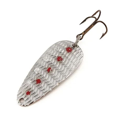 Hamrade nickelfjäll fångar ljuset över den texturerade framsidan på detta klassiska amerikanska skeddrag. Med en längd på 4,5 cm och en vikt på 7 g har metallkroppen flera handmålade röda accenter i fjällmönstret för att ge en klassisk visuell kontrast. På den konkava baksidan identifierar en tydlig stämpling draget som 'THOMAS 1/4 OZ S515 CYCLONE', vilket stämmer överens med produktkod 13131. Komponenterna består av en robust fjäderring och en bronserad trekrok, båda bevarade i toppskick. Med betyget 5/5 förblir den reflekterande ytan blank och klar, vilket visar på det hantverk som är typiskt för Thomas Spinning Lures från USA. Ett fästhål är borrat i den smala änden för säker anslutning till lina eller lekande.