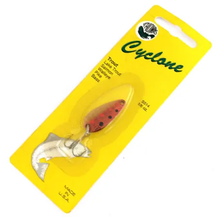 Red Trout-mönstret på detta exemplar har en djupröd bas med tydliga svarta prickar, ett klassiskt val för att efterlikna små betesfiskar. Med en vikt på 1/8 oz (4,3 g) och en längd på 1 1/4" (3,2 cm) är Thomas Cyclone ett mångsidigt verktyg för lätt spinnfiske. Detta oanvända drag, med produktkod 9916, förvaras i sin gula originalförpackning som framhäver dess effektivitet för öring, kanadaröding, lax och gös. Skeddragets metallkonstruktion är stämplad med "Made in U.S.A." och speglar varumärket Thomas tillverkningstradition. Monteringen består av en trekrok fäst med en fjäderring, lämplig för både sött och lätt bräckt vatten.