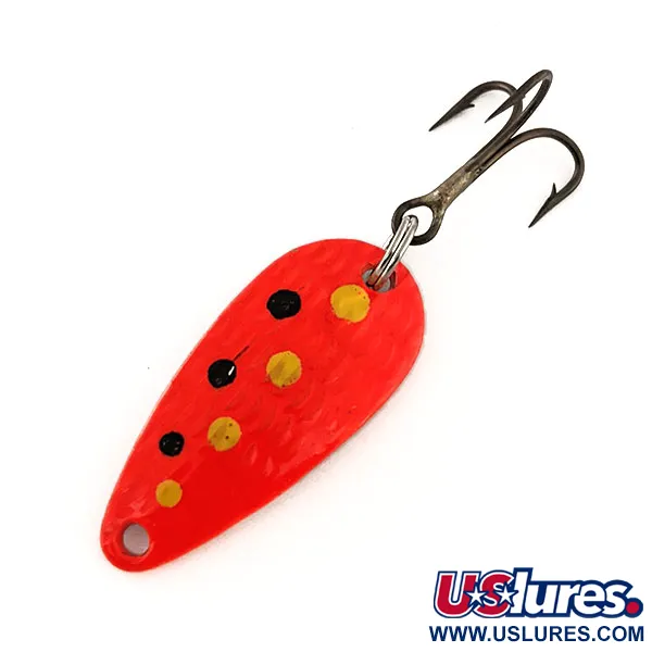 Hamrad textur täcker kroppen på denna Thomas Cyclone UV, vilket säkerställer att metallen fångar ljuset från alla vinklar. Detta skeddrag med produktkod 11492 är 1 1/4" (3 cm) långt och har en fluorescerande orange bas med handmålade gula och svarta prickar. Under UV-ljus avger finishen en tydlig lyster, en designdetalj avsedd för miljöer med dålig sikt eller djupare vatten. Detta skeddrag på 1/8 oz (4,3 g) är tillverkat i USA och har kvar sin originalutrustning, inklusive fjäderring och en bronserad trekrok. Exemplaret är i 5/5-skick, där finish och metallkomponenter ser rena och välbevarade ut.