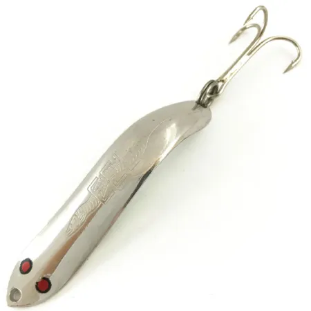 En polerad nickelfinish definierar den 6 cm långa kroppen på detta vintage skeddrag, som har två distinkta röda ögonpunkter målade nära linfästet. På framsidan finns namnet ”EEL” instämplat tillsammans med ett detaljerat fiskmotiv, karaktäristiskt för Thomas Lures produktion från USA. Trots att den har produktkod 5657 och en angiven vikt på 10 g, visar metallens baksida en fabriksstämpel på ”3/8 OZ” tillsammans med modellnummer R324 och varumärkeslogotypen. Hårdvaran består av eine robust trekrok fäst med en fjäderring, utan tecken på användning. Detta exemplar är i utmärkt skick 5/5 och bibehåller en spegelblank lyster över sin böjda yta. Draget är balanserat för olika kast- och trollingapplikationer där en smal profil krävs.