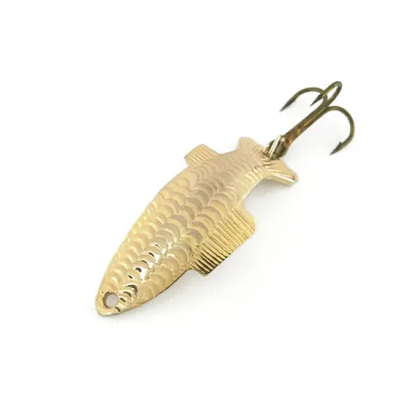 Präglat fjällmönster täcker den konvexa sidan av detta 4 cm (1 1/2") skeddrag, vilket ger en verklighetstrogen struktur som förstärker ljusreflektionerna vid invevning. Med en vikt på 7 g (1/4 oz) är detta guldfärgade Thomas Fighting fish, katalogiserat under produktkod 8619, ett klassiskt exempel på amerikanskt beteshantverk. Baksidan är slät och bär den djupa stämpeln 'FIGHTING FISH', som tydligt identifierar modellnamnet mot den glänsande guldytan. Just detta bete håller skicket 5/5, där plätering och hårdvara förblivit anmärkningsvärt blanka och funktionella. Profilen inkluderar en utsvängd fena nära stjärten, som leder till den fabriksmonterade trekroken. Betet härstammar från USA och återspeglar den hållbara tillverkningsstandard som ofta kännetecknar vintagehårdvara från Thomas.