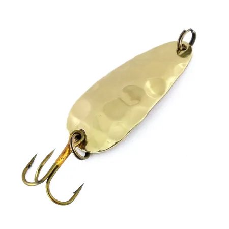 Handstämplad text på baksidan av detta skeddrag i mässing lyder "RICHARDS 1/5 OZ CANDU IT", en personlig hyllning till grundaren Richard Shubert som etablerade märket Thomas i mitten av 1940-talet efter att ha anlänt till USA från Tjeckoslovakien. Katalogiserat under produktkod 10715, har draget en vikt på 5 g (3/16 oz) och en total längd på 4 cm (1 1/2"). En tydlig hamrad yta täcker den konvexa sidan, vilket ger en traditionell estetik för spinnfiske eller trolling. Hårdvaran består av en bronserad trekrok och två robusta fjäderringar, som alla är exceptionellt rena, vilket bidrar till ett skickbetyg på 5/5 för detta vintageexemplar. De polerade mässingsytorna bevarar den ursprungliga lystern och de skarpa gravyrerna, och hedrar en tillverkare som kom till Amerika för att förverkliga sin dröm om att producera fiskeredskap av hög kvalitet.