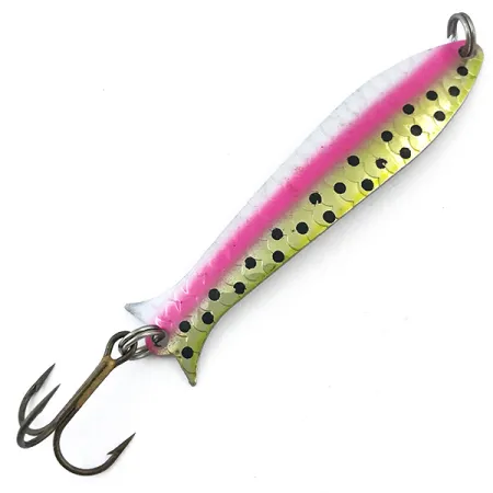 Detta 6,5 cm (2 1/2") skeddrag är stämplat på baksidan med den klassiska logotypen och viktangivelse, och uppvisar den hållbara nickelpläteringen som är synonym med Thomas amerikanska tillverkning. Trout / Nickel-ytan är särskilt slående och kombinerar en djärv neonrosa sidolinje med guldgröna fjällaccenter och en serie djupsvarta prickar. Betet väger 5 g (3/16 oz) och är specialbyggt för trolling, med en slank, avlång profil för att maximera synligheten under olika ljusförhållanden. Detta specifika exemplar, med produktkod 5040, är i skick 5/5, där färg och hårdvara ser exceptionellt välbevarade ut. Det är riggat med två starka fjäderringar och en vass trekrok i stjärten, vilket understryker den kvalitetskonstruktion som förväntas av ett vintage USA-tillverkat bete.